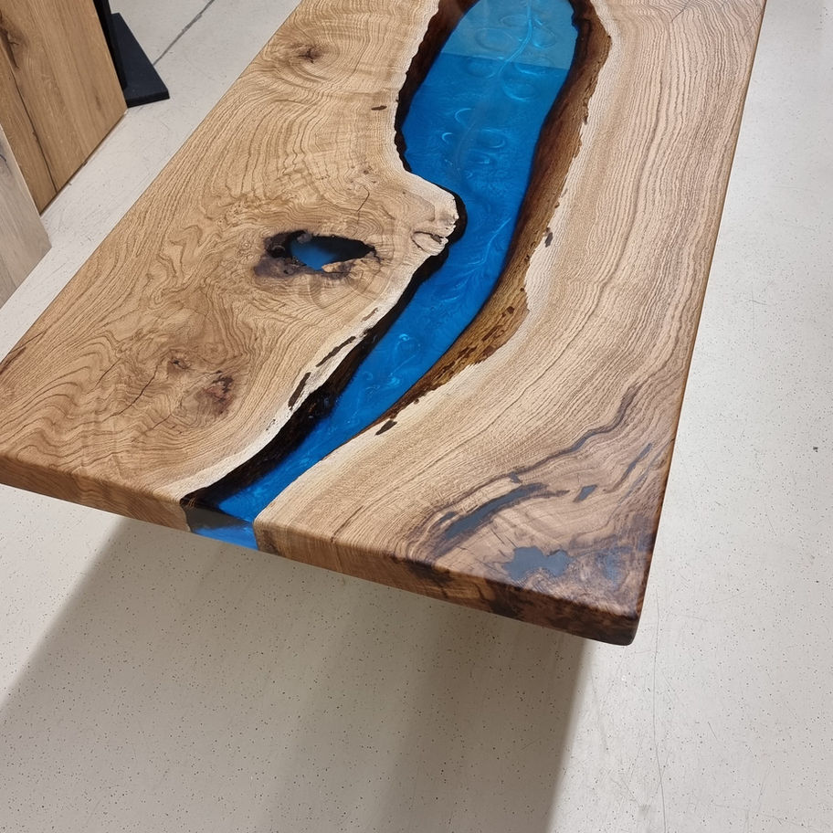 Epoxyharztisch aus Eiche, von Hand angefertigt, Transparantes glänzendes nachtblaues Epoxidharz